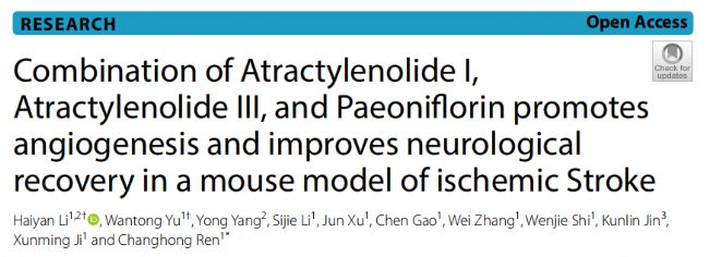 文章于2024年1月發(fā)表在《Chinese Medicine》雜志,作者來自首都醫(yī)科大學北京腦疾病研究所腦卒中研究中心。中醫(yī)理論認為治療缺血性中風應該從改善血瘀、氣虛和郁結入手,核心癥候包括瘀血證、痰證、陰虛、氣虛、肝亢等。 當代中醫(yī)研究確定了幾種具有神經(jīng)保護作用的有效提取物,包括活性AMK成分白術內酯 I (Atr I)和白術內酯 III (Atr III)以及芍藥甙(Pae),已經(jīng)顯示出比較好的藥理學作用,包括神經(jīng)保護,抗炎,抗氧化,抗過敏和抗癌特性。本研究旨在探索Atr I,Atr III和Pae聯(lián)合使用是否可以促進中風后大腦血管的形成,從而改善缺血性中風神經(jīng)功能的恢復。