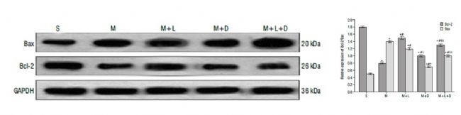 為了闡明LiCl神經(jīng)保護作用的分子機制,在大鼠腦缺血后的海馬組織中,評估了與凋亡相關(guān)的兩種蛋白(Bcl-2抗凋亡蛋白)、Bax促凋亡蛋白)的表達水平。MCAO共分為五組,S組為模擬處理的對照組;M組中動脈閉塞組模擬人類缺血性中風(fēng);M+L組為中動脈閉塞后皮下注射LiCl,評估LiCl對缺血性腦損傷的潛在神經(jīng)保護作用;M+D組為中動脈閉塞手術(shù)前,側(cè)腦室注射了Wnt信號通路的抑制劑DKK1,探究Wnt信號通路在腦缺血損傷中的作用;M+L+D組為中動脈閉塞手術(shù)前注射了DKK1,手術(shù)后皮下注射LiCl,評估DKK1對LiCl神經(jīng)保護效果的可能影響。Western blot結(jié)果(圖1)顯示,M組Bcl-2表達明顯低于S組,LiCl給藥后顯著抑制了這種表達水平的降低。此外,與S組相比,M組的Bax表達顯著增加,LiCl可顯著預(yù)防這種情況。然而,Wnt信號通路抑制劑DKK1僅逆轉(zhuǎn)了對Bcl-2表達的影響。