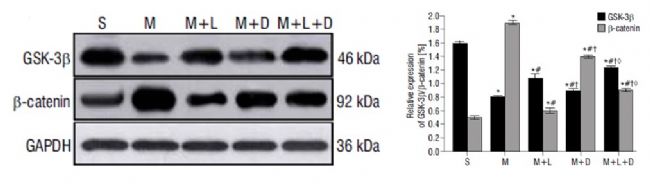圖2 Wnt信號通路中關(guān)鍵蛋白GSK-3β、β-catenin的表達水平,左圖為蛋白條帶圖,右圖為對應(yīng)的光強度分析結(jié)果