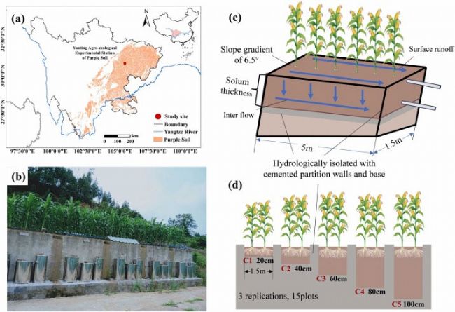 現(xiàn)場(chǎng)監(jiān)測(cè)共設(shè)計(jì)15個(gè)小區(qū)。小區(qū)尺寸為5mx 1.5m,坡度為6.5°,模擬長(zhǎng)江上游坡耕地的平均梯田坡度。試驗(yàn)設(shè)置了5種土壤厚度處理(20 cm、40 cm、60 cm、80 cm、100 cm),每個(gè)處理重復(fù)3次。試驗(yàn)小區(qū)通過(guò)無(wú)縫水泥墻和基座進(jìn)行水文隔離,構(gòu)建不同厚度的防滲混凝土盆并重新填筑原有土層。經(jīng)過(guò)8年的常規(guī)耕作(小麥-玉米輪作)后,確保土壤剖面保持原狀。所有處理均采用相同的施肥管理(氮肥150 kg·hm−2,磷肥90 kg·hm−2,鉀肥36 kg·hm−2)和種植模式,玉米于2020年5月移栽,9月收獲,全程不灌溉。