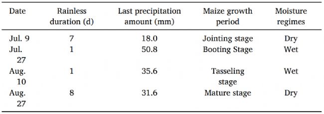 采樣在干濕交替條件下進(jìn)行。2020年7月9日(拔節(jié)期)、7月27日(孕穗期)、8月10日(抽雄期)、8月27日(成熟期)分別采集土壤和玉米莖樣品。7月9日和8月27日為干旱期,持續(xù)7-8天;7月27日和8月10日為降雨后的濕潤(rùn)期。上午8-9點(diǎn),從15個(gè)地塊的玉米莖第一節(jié)間采集樣品,同時(shí)在莖采樣位置附近的不同深度(0-100 cm)采集土壤樣品。部分樣品用玻璃瓶密封后冷凍保存,測(cè)定氫和氧穩(wěn)定同位素;另一部分樣品帶回實(shí)驗(yàn)室,在105℃烘干24小時(shí)至恒重,以確定土壤含水量。