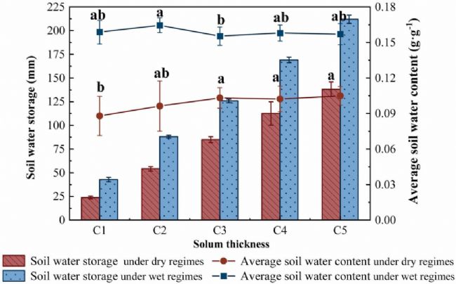 圖2 土壤厚度20 cm (C1)、40 cm (C2)、60 cm (C3)、80 cm (C4)、100 cm (C5)處理土壤儲(chǔ)量及平均含水量的變化特征。