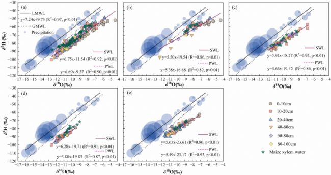 圖3 不同土層雨水、玉米莖水及土壤水的δ2H與δ18O關(guān)系。(a)所有采樣日期擬合δ2H與δ18O得到的線性方程;(b)7月9日擬合δ2H與δ18O得到的線性方程;(c)7月27日擬合δ2H與δ18O得到的線性方程;(d)8月10日擬合δ2H與δ18O得到的線性方程;(e)8月27日擬合δ2H與δ18O得到的線性方程。