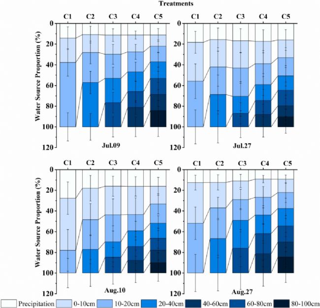 圖5 采樣期間土壤厚度20 cm (C1)、40 cm (C2)、60 cm (C3)、80 cm (C4)、100 cm (C5)處理不同土層土壤水及雨水對(duì)莖水相對(duì)貢獻(xiàn)比例的變化。