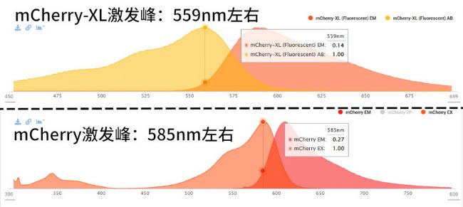 熒光團(tuán)改良后,不僅熒光強(qiáng)度更高、熒光壽命更長,其激發(fā)發(fā)射屬性也可能發(fā)生變化。比如mCherry-XL和mScarlet3,它們需要使用Y通道激發(fā),而不是原版mCherry的R通道激發(fā)。