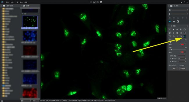 能量曲線使用非常簡單,選中工具后可以在成像窗口或圖片上畫線,然后系統(tǒng)就會在線上生成一個曲線圖,紅藍(lán)綠三色熒光分別呈現(xiàn)為紅藍(lán)綠三色曲線。曲線圖以用戶畫的線為X軸,以光強(qiáng)為Y軸,Y軸有100%和50%兩條線,可快速估算熒光強(qiáng)度。
