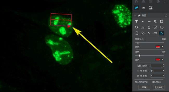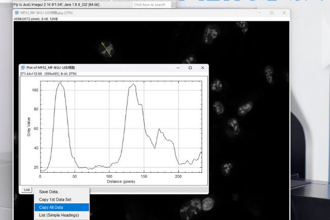 能量曲線方便易用,直觀快速但不夠量化,要更量化地進(jìn)行徑向熒光強(qiáng)度分析,需要用到ImageJ或者說FIJI(JIFI是更新版的ImageJ).首先打開熒光圖片,使用直線工具畫線,注意畫線對比時長度數(shù)據(jù)要一致。