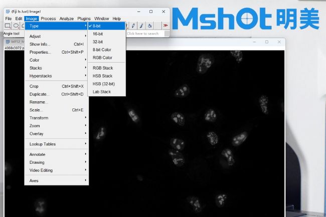 我們這個熒光圖是單色熒光,因此我們這里先將其轉(zhuǎn)化成8bit格式,減少其他通道信號可能帶來的問題,在菜單選項選擇Image-Type-8bit.