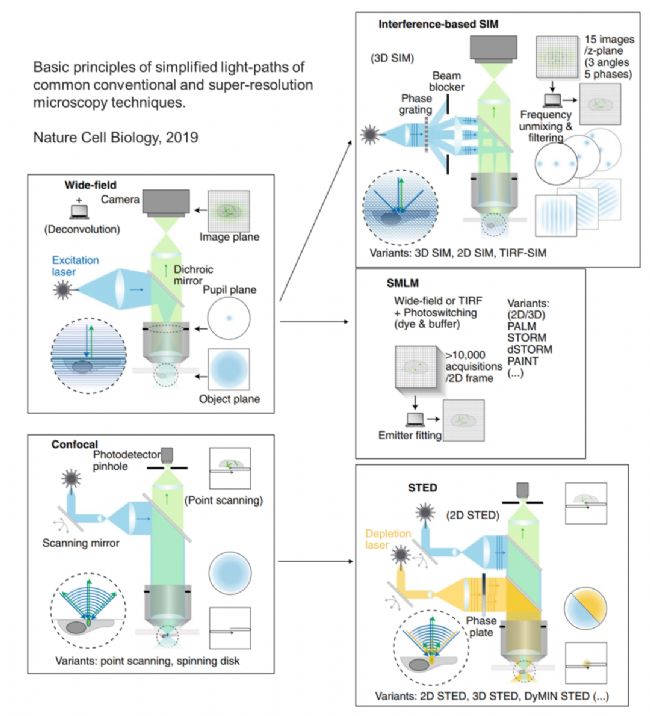 SIM本質是激發(fā)光透過可橫向移動的光柵產生正弦條紋圖案照射樣品,正弦條紋照明圖案與樣品本身的信息疊加形成莫爾條紋,將樣品結構中的高空間頻率信息轉變?yōu)榭赏ㄟ^物鏡收集的較低空間頻率信息,最后通過后期數(shù)據(jù)處理得到樣品的高分辨圖像。SIM的單幅原始圖像的采集速度只取決于樣品的熒光信號強度和探測器的采集速度,通常只需要采集9幀原始圖像,與基于點掃描成像的STED和需要采集幾萬幀原始圖像的SMLM相比,要快得多,基本可以達到實時觀察。但SIM受其成像原理的制約,最多只能將橫向分辨率提升為傳統(tǒng)顯微鏡的2倍(即100 nm左右),因此分辨率遠不及其他超高分辨顯微鏡技術。但SIM對熒光探針沒有光開關或抗淬滅的特殊需求,其最大的優(yōu)勢也是寬場成像速度快,所以更多更廣泛地應用在活細胞成像領域。