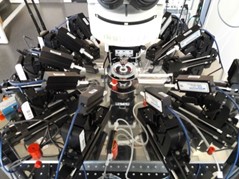 膜片鉗裝置,用于同時(shí)記錄多達(dá) 10 個(gè)神經(jīng)元(A patch clamp rig for simultaneous recordings from up to ten neurons (Image kindly provided by the lab of Prof. Jörg Geiger, Charité Berlin)。