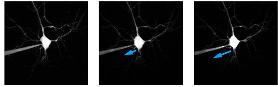 漂移電極:用充滿染料的移液器修補(bǔ)的第 5 層神經(jīng)元。在第一個(gè)(左)面板中,移液器緊貼著細(xì)胞。在連續(xù)的圖像中,電極從細(xì)胞中漂移,拉伸膜并導(dǎo)致進(jìn)入阻力增加(image kindly provided by Dr. Grit Bornschein, Carl Ludwig Institute, Leipzig University)。