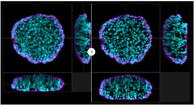 XY Z圖像對比,左:LUPLAPO25XS(硅凝膠)與右:UPLXAPO20X(干式物鏡)
