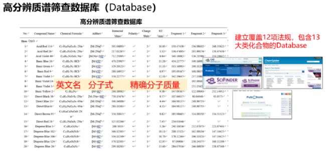 針對上述問題,青島海關技術中心團隊近年在國家重點研發(fā)計劃、質(zhì)檢公益性行業(yè)科研專項等課題資助下,在賽默飛世爾科技(中國)有限公司的技術支持下,建立了覆蓋全球12大項法規(guī)標準,包含12大類312種化合物的重點消費品有害化學物質(zhì)高分辨質(zhì)譜篩查數(shù)據(jù)庫和質(zhì)譜譜庫。在此基礎上,建立了可同時分析紡織材質(zhì)中11大類211種化合物的多靶標高通量分析方法。