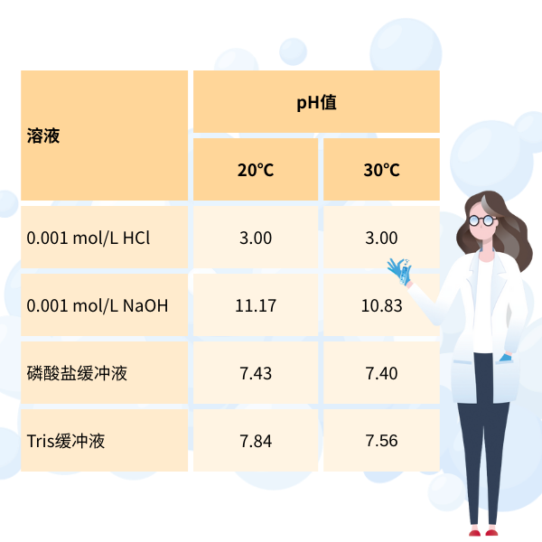 比如,0.001 mol/L的HCl在20℃和30℃時的pH值都是3.00,但0.001 mol/L的NaOH在20℃時pH值為11.17,到了30℃就降到了10.83。磷酸鹽緩沖液和Tris緩沖液也會隨著溫度的變化而出現(xiàn)pH值的波動。