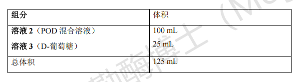 4.& 5. 用蒸餾水將 5 號(hào)瓶內(nèi)容物稀釋至近 40 mL,得到溶液 4。用約 3 mL溶液 4 溶解 4 號(hào)瓶內(nèi)容物。將溶液定量轉(zhuǎn)移至一個(gè) 50 mL 的容量瓶中。再用約 5 mL 溶液 4 沖洗 4 號(hào)瓶,將剩余內(nèi)容物轉(zhuǎn)移至容量瓶中。將剩余溶液 4 倒入容量瓶中,用蒸餾水定容至 50 mL。將溶液分裝成10 mL 小份儲(chǔ)存在聚丙烯容器中,得到溶液 5(葡萄糖氧化酶標(biāo)準(zhǔn)溶液)。