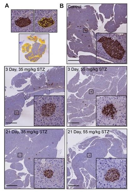 圖 1 免疫組化標(biāo)記胰島素,蘇木精反染后的胰腺組織病理學(xué)觀察(B)[1]