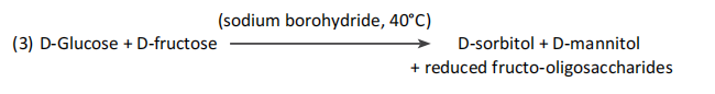 D-葡萄糖和D-果糖被硼氫化鈉還原為相應(yīng)的糖醇、D-山梨醇和D-甘露醇。在這個(gè)反應(yīng)中,水解菊粉制劑中低聚果糖還原端的D-果糖基殘留物也被還原為糖醇。天然果聚糖和非還原性FOS,如Neosugs®,不受此反應(yīng)的影響(3)。