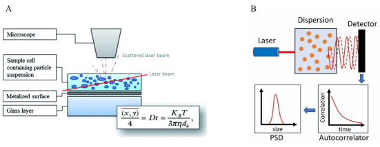隨著納米技術(shù)的飛速發(fā)展,納米顆粒在眾多領(lǐng)域展現(xiàn)出獨特的應用潛力,如生物醫(yī)藥、材料科學、環(huán)境科學等。在這些應用中,精確測定納米顆粒的尺寸、濃度、表面電荷等特性至關(guān)重要,因為這些參數(shù)直接影響著納米材料的性能、穩(wěn)定性以及與生物系統(tǒng)的相互作用。傳統(tǒng)的納米顆粒分析技術(shù),如電子顯微鏡(EM)和掃描探針顯微鏡(SPM),雖然能夠提供高分辨率的圖像,但樣品制備復雜、檢測通量低,且通常只能對靜態(tài)樣品進行分析,難以滿足對納米顆粒在溶液中動態(tài)行為研究的需求。動態(tài)光散射(DLS,圖1B)技術(shù)作為一種常用的光學集合技術(shù),長期以來被廣泛應用于納米顆粒分散體系的分析,能夠快速、準確地測定顆粒尺寸。然而,DLS 在面對多分散樣品時可靠性下降,其獲得的強度加權(quán)平均尺寸(“z 平均”)并不總能準確反映樣品的真實組成。此外,通過經(jīng)典反卷積算法對相關(guān)函數(shù)進行分析以提取例如雙峰分布的能力,實際上僅限于僅包含兩種或至多三種尺寸顆粒類型的樣品,且每種顆粒類型的尺寸差異需在實踐中大于 3:1。納米顆粒跟蹤分析技術(shù)(NTA,圖1A)的出現(xiàn)為納米顆粒的表征提供了一種全新的解決方案,它能夠?qū)崟r、逐個地跟蹤和分析納米顆粒在溶液中的布朗運動,從而獲取顆粒的尺寸、濃度等信息,彌補了傳統(tǒng)技術(shù)的諸多不足。