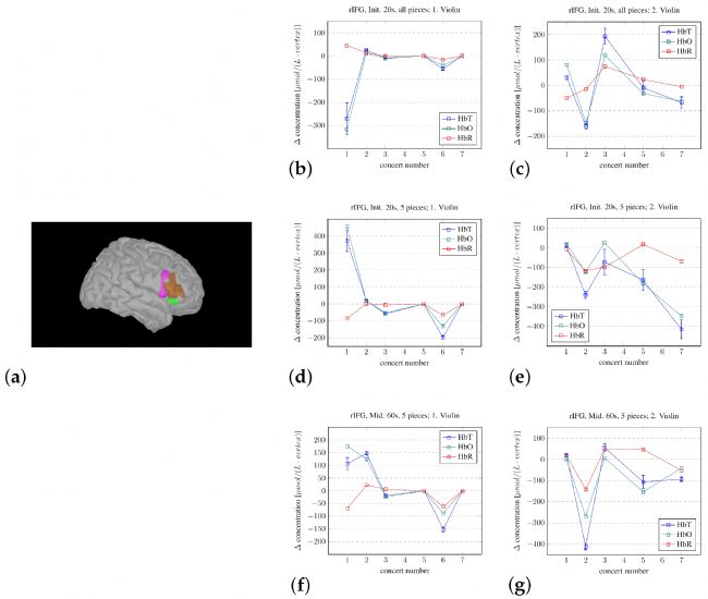 圖4. 兩位小提琴手在不同音樂(lè)會(huì)中右下額葉回(rIFG)的活動(dòng)變化情況。(a)右下額葉回(rIFG),由三角部、島蓋部和眶部這三部分構(gòu)成。分析所有樂(lè)曲開(kāi)頭 20 秒的血流動(dòng)力學(xué)變化(b、c),5 首選定較長(zhǎng)樂(lè)曲開(kāi)頭 20 秒的血流動(dòng)力學(xué)變化(d、e),以及 5 首選定較長(zhǎng)樂(lè)曲中間 60 秒的血流動(dòng)力學(xué)變化(f、g)