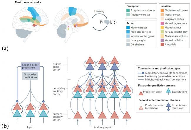 圖5. 音樂(lè)通過(guò)幾個(gè)不同的區(qū)域和相關(guān)網(wǎng)絡(luò)影響大腦。(a)不同解剖區(qū)域與音樂(lè)感知的關(guān)聯(lián)概述。(b)音樂(lè)預(yù)測(cè)編碼(PCM)模型