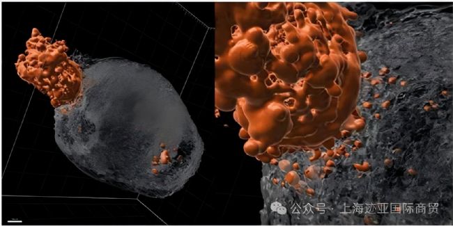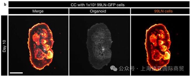 融合了乳腺到大腦(99LN,橙色)球形體的腦類器官組織的3D 圖像,表明癌細胞在 5 天內(nèi)遷移到腦組織中。比例尺:100um