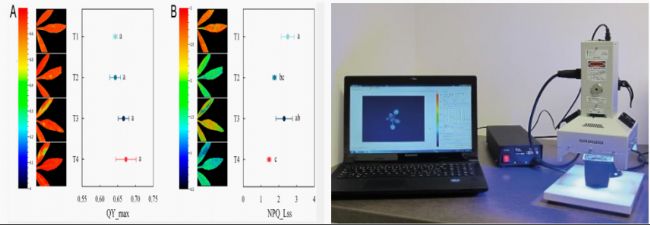上左圖為不同修復(fù)處理之間葉綠素?zé)晒鈪?shù)的變化:(A)QY_ max(最大光量子產(chǎn)率);(B)NPQ _ Lss(非光化學(xué)熒光猝滅);右圖為便攜式葉綠素?zé)晒獬上瘢╔in Fang, Cong Shi, Fuchen Shi, etc. 2025. Phytoremediation of Oil-Contaminated Soil by Tagetes erecta L. Combined with Biochar and Microbial Agent)