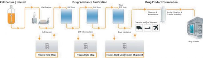 圖1:冷凍和融化操作通常用于整個(gè)下游純化過程,從生物分子加工到成品生物制藥制造,如本文所述。