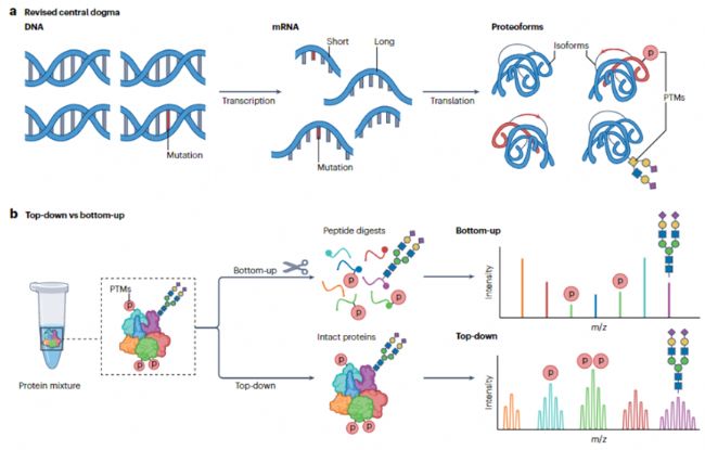 中心法則描述了信息從 DNA 流向mRNA,最終轉(zhuǎn)化為執(zhí)行生物學(xué)功能的蛋白質(zhì)的過(guò)程。大量的 proteoforms 形成了化學(xué)性質(zhì)多樣的蛋白質(zhì)家族。proteoforms 的產(chǎn)生源于翻譯后修飾(PTMs)、RNA 可變剪接以及遺傳變異(圖 1a)。因此,