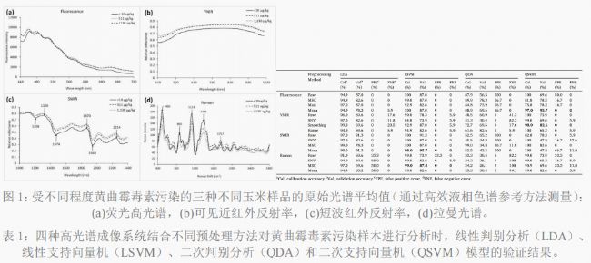 美國農(nóng)業(yè)部農(nóng)業(yè)研究局與韓國國家農(nóng)產(chǎn)物品質(zhì)管理院合作,利用高光譜成像技術(shù)結(jié)合機(jī)器學(xué)習(xí)分類模型,對122份天然污染的玉米粉樣本進(jìn)行了深入探究。研究以高效液相色譜(HPLC)測定黃曲霉毒素含量為參照,驗(yàn)證了可見光近紅外反射(VNIR)、短波紅外反射(SWIR)、熒光高光譜(365nm激發(fā)光)和拉曼高光譜(785nm激光)四種高光譜成像技術(shù)在玉米黃曲霉毒素檢測中的準(zhǔn)確度和精度。結(jié)果表明,"365nm紫外光激發(fā)的熒光高光譜結(jié)合QSVM模型"以及"短波紅外反射高光譜結(jié)合LSVM模型"表現(xiàn)最為優(yōu)異,在