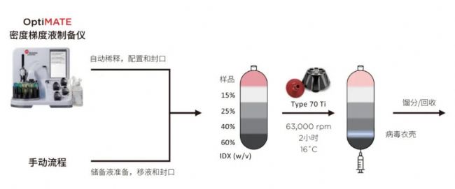 圖1:全自動(上)與手動(下)配置15-60% w/v IDX不連續(xù)密度梯度液的AAV純化方案對比