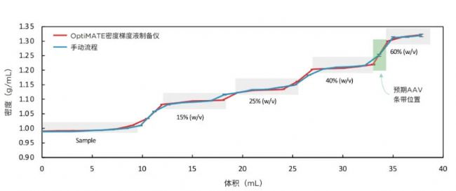 血清型2 AAV通過三重轉染在HEK-293細胞中進行表達后。裂解細胞并離心以去除碎片。然后,使用類似于梯度分析實驗的15-60%(w/v)IDX不連續(xù)密度梯度液(表1,圖1)純化含有AAV的裂解澄清物。在自動組中,使用OptiMATE將IDX不連續(xù)密度梯度液分配到39 mL聚丙烯快封管中。每個離心管中加入2.08×1012病毒基因組(vgs)的AAV。在手動組中,使用OptiMATETM IDX制備IDX儲備溶液(15%、25%、40%和60%),然后使用注射器和鈍頭針頭通過底層法將每層梯度液分配到離心管中。自動組制備的離心管在儀器上自動進行密封,而手動組制備的離心管用無線熱封器手動封口。在Optima XPN-90超速離心機中,使用Type 70 Ti轉子中于16 °C下以63,000 rpm(407,427 xg)將離心管離心2小時。離心后,通過側面穿刺提取AAV條帶(在40%-60% IDX界面處),并使用離心旋轉過濾器進行緩沖液替換。通過qPCR(AAVPro滴定試劑盒,Takara Bio)對vgs進行定量以評估回收率。