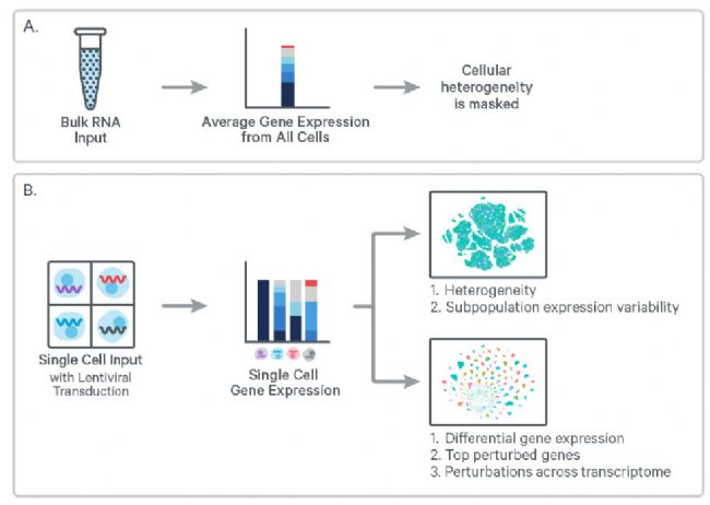 CRISPR篩選是功能基因組學(xué)研究人員不可或缺的工具,但傳統(tǒng)篩選方法既復(fù)雜又耗時(shí),而且數(shù)據(jù)輸出的分辨率低。傳統(tǒng)篩選實(shí)驗(yàn)使用Bulk RNA 輸入來評(píng)估所有細(xì)胞的平均基因表達(dá)水平,從而掩蓋了細(xì)胞異質(zhì)性;與之不同的是,單細(xì)胞 CRISPR 篩選技術(shù)能在單細(xì)胞水平上,評(píng)估整個(gè)轉(zhuǎn)錄組中多個(gè)基因以及每個(gè)單獨(dú) sgRNA 的擾動(dòng)效應(yīng)。(圖1)