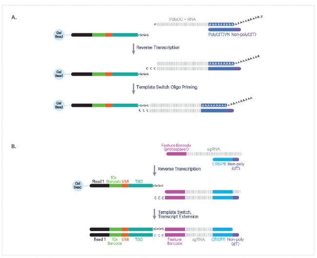 采用 Feature Barcode 技術(shù)進(jìn)行 CRISPR 篩選的 Chromium 單細(xì)胞免疫組庫分析(也稱為單細(xì)胞 5' 端 CRISPR 篩選)提供了一種多組學(xué)研究方法,可從同一個(gè)單細(xì)胞中同時(shí)檢測(cè)基因表達(dá)、CRISPR 向?qū)Х肿、?xì)胞表面蛋白和 / 或免疫細(xì)胞克隆型頻率。這種單細(xì)胞 5' 端 CRISPR 篩選方法與大多數(shù) Cas9 CRISPR 載體兼容,且無需在向?qū)?RNA(sgRNA)中整合特定捕獲序列。