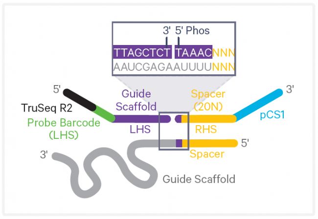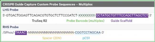 · 左側(cè)探針(LHS Probe)包含TruSeq R2、探針條形碼(Probe Barcode)以及一段25 bp的向?qū)Ч羌芑パa(bǔ)序列。TruSeq 接頭可添加CRISPR文庫的Index。