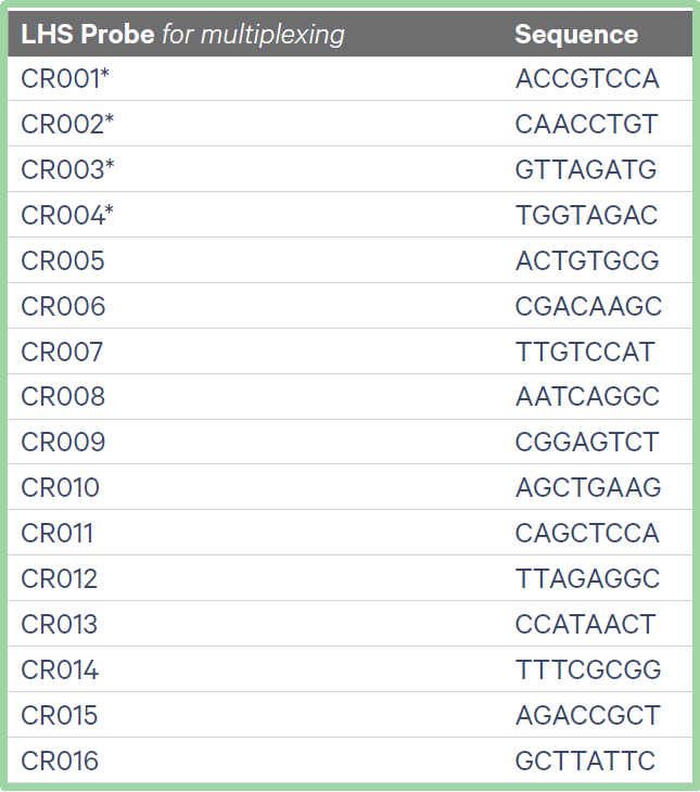 在多樣本混樣實(shí)驗(yàn)中,每個(gè)左側(cè)探針(LHS Probe)必須帶有唯一的 8 堿基探針條形碼(CR001-CR016;序列詳見表 2),且每個(gè)雜交反應(yīng)的 CRISPR 探針和全轉(zhuǎn)錄組擴(kuò)增(WTA)探針均需使用唯一的探針條形碼對(duì),即同一 CRISPR 探針條形碼不得與多個(gè) WTA 探針條形碼搭配使用。在單重實(shí)驗(yàn)中,可省略該探針條形碼。