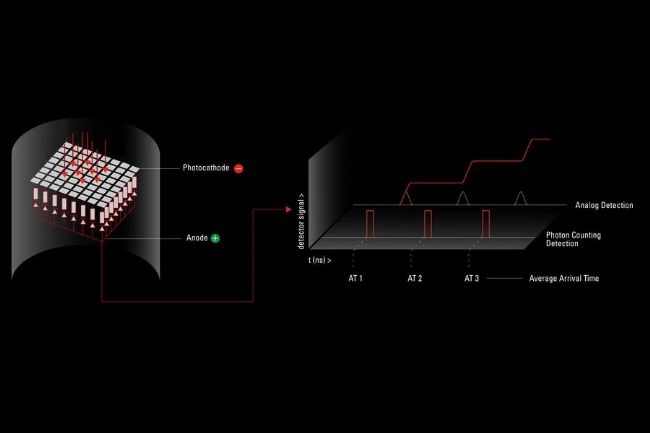 左:示意圖顯示 Power HyD S 探測器的多單元結構。右:在兩種可用工作模式(光子計數(shù)和模擬)下對探測器信號的處理。