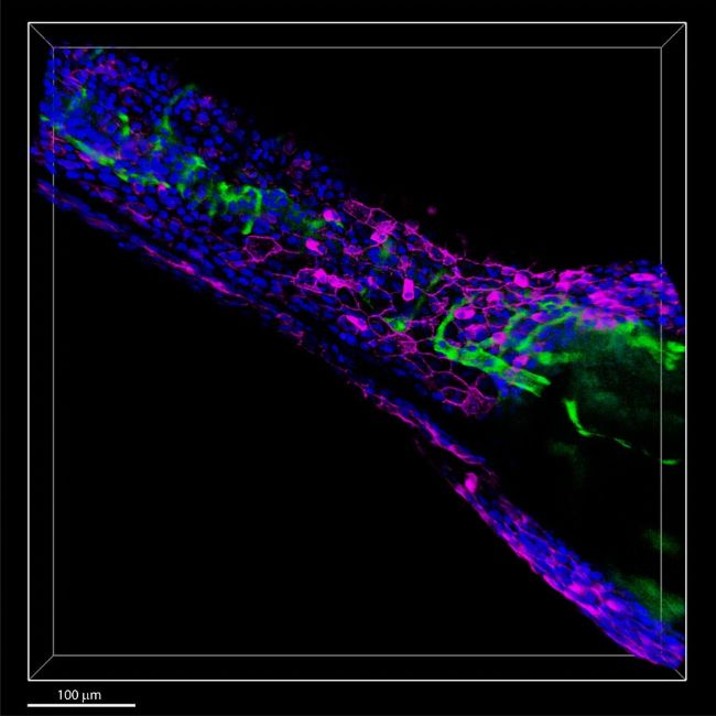 斑馬魚胚胎。 用STELLARIS 8獲得3D圖像,裝配Power HyD S(細胞核:藍色,Hoechst)、Power HyD X(內皮細胞:綠色,EGFP)和Power HyD R探測器(細胞膜:品紅色,NIR750)。 樣本由法國斯特拉斯堡的IGBMC的Julien Vermot提供