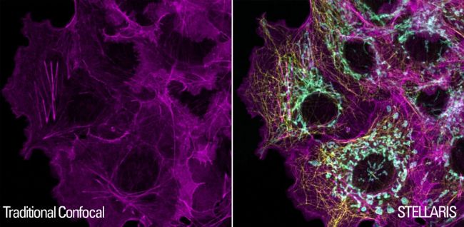 Cos-7細胞圖像,使用SiR-Actin(657 – 740納米探測范圍)、AF750-Tom20(760 – 790納米)、AF790-Tubulin(810 – 850納米)標記。 樣本由蘇黎世大學的Jana Döhner和Urs Ziegler提供。 左: 使用傳統(tǒng)的GaAsP探測器。 右: 使用STELLARIS 8。