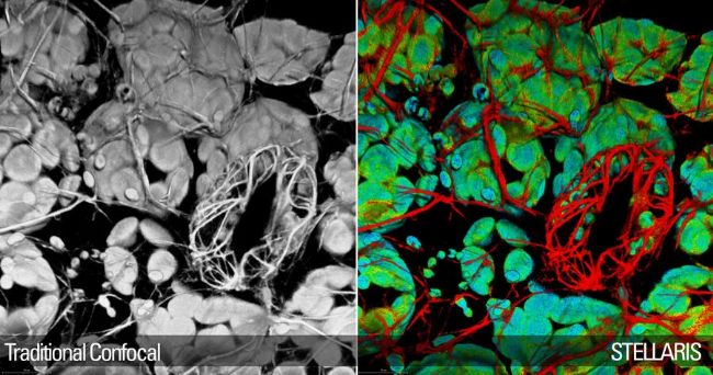 用WGA-CF488染料標記的海拉細胞。 左: 傳統(tǒng)的光子計數(shù)結果;右: Power Counting的結果。 圖中為Z-stack的最大強度投影,用12kHz共振掃描儀獲得,用LIGHTNING處理Power HyD S探測器是STELLARIS的新核心部分。這些硅基多像素光子計數(shù)器(MPPC)探測器是徠卡顯微系統(tǒng)多年工程設計經驗的成果。這一增強的圖像質量樹立起共聚焦成像新標準。