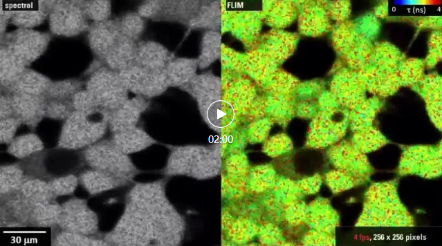 用凝血酶活化肽刺激后的鈣振蕩。 單個細胞中的響應被記錄為壽命變化。 視頻以4 pfs速率拍攝。 圖像大小: 256 x 256個像素。 顏色條的尺度(壽命):ns。 由荷蘭阿姆斯特丹癌癥研究所的Kees Jalink和Bram van den Broek提供。