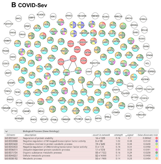 圖3. 新冠誘導(dǎo)IgG靶向蛋白的蛋白質(zhì)-蛋白質(zhì)相互作用網(wǎng)絡(luò)(PPIN)分析。使用COVID-Mod組(136個(gè)節(jié)點(diǎn))和COVID-Sev組(168個(gè)節(jié)點(diǎn))的IgG靶向蛋白完整列表(包含兩組共同靶向蛋白)進(jìn)行PPIN分析,數(shù)據(jù)通過(guò)STRING平臺(tái)(STRING Consortium, 2024)分析。對(duì)所有鑒定蛋白分別進(jìn)行了結(jié)構(gòu)同源性和共表達(dá)評(píng)估。網(wǎng)絡(luò)圖中節(jié)點(diǎn)代表蛋白質(zhì)靶點(diǎn),連線代表基于結(jié)構(gòu)同源性(黑色)或共表達(dá)(紫色)的蛋白質(zhì)-蛋白質(zhì)關(guān)聯(lián)。通過(guò)基因本體(GO)生物過(guò)程分析識(shí)別顯著富集通路(錯(cuò)誤發(fā)現(xiàn)率FDR < 0.05)。(A) COVID-Mod組未發(fā)現(xiàn)顯著富集的生物過(guò)程。(B) COVID-Sev組中節(jié)點(diǎn)按其涉及的最相關(guān)生物過(guò)程進(jìn)行顏色編碼,具體對(duì)應(yīng)關(guān)系見附表。
