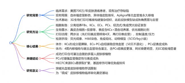 突破了現(xiàn)有無(wú)血管皮膚替代品的存活限制,為慢性皮膚潰瘍的永久治療提供新方案,同時(shí)為“現(xiàn)成”(off-the-shelf)生物工程皮膚的臨床轉(zhuǎn)化奠定基礎(chǔ)。