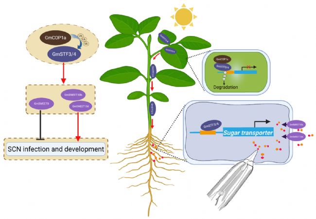研究結(jié)果顯示,光照條件下,大豆對SCN的敏感性增強(qiáng),這可能是由于 SCN 感染誘導(dǎo)了光信號通路相關(guān)基因的表達(dá),從而促進(jìn)了 GmSTF3/4 從地上部轉(zhuǎn)運(yùn)到根部。GmSTF3/4 作為光信號通路中的下游蛋白,結(jié)合到多個(gè)糖轉(zhuǎn)運(yùn)蛋白基因的啟動子,激活其轉(zhuǎn)錄,促進(jìn)蔗糖等糖分的轉(zhuǎn)運(yùn),為SCN提供營養(yǎng),促進(jìn)其發(fā)育。其中,糖轉(zhuǎn)運(yùn)蛋白GmSWEET10b具有蔗糖和己糖轉(zhuǎn)運(yùn)活性,其表達(dá)上調(diào)促進(jìn)SCN感染和發(fā)育。另一方面,GmCOP1a與GmSTF3/4相互作用,并介導(dǎo)其降解,從而抑制SCN感染和發(fā)育。