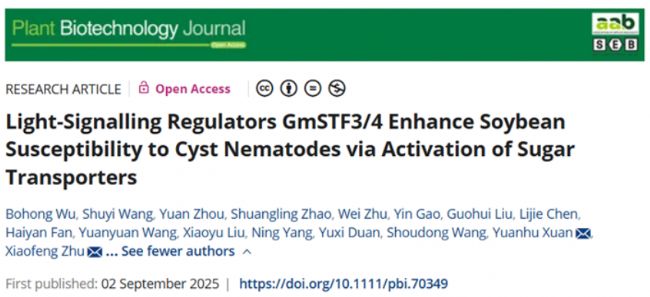 近日,《Plant Biotechnology Journal》雜志在線發(fā)表了由沈陽農(nóng)大朱曉峰教授團(tuán)隊(duì)和南開大學(xué)玄元虎教授團(tuán)隊(duì)合作撰寫的論文“Light-signaling regulators GmSTF3/4 enhance soybean susceptibility to cyst nematodes via activation of sugar transporters”。研究以光信號通路中從莖到根的可移動蛋白GmSTF3/4為研究對象,探究其在胞囊線蟲侵染過程中的生物學(xué)功能及調(diào)控機(jī)制。