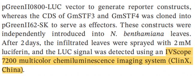 研究中使用IVScope 7200植物活體成像系統(tǒng)進(jìn)行雙熒光素酶報(bào)告基因 (DLR) 實(shí)驗(yàn),以驗(yàn)證GmSTF3/4對糖轉(zhuǎn)運(yùn)蛋白基因啟動子的轉(zhuǎn)錄激活作用。結(jié)果表明,與空載體對照組相比,與 GmSTF3/4 共表達(dá)的報(bào)告基因啟動子的熒光信號強(qiáng)度顯著增強(qiáng),這表明 GmSTF3/4 能夠激活目標(biāo)糖轉(zhuǎn)運(yùn)蛋白基因啟動子的轉(zhuǎn)錄活性。