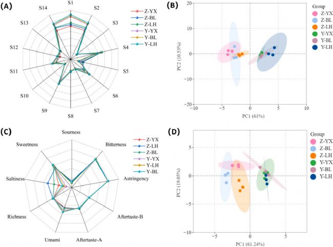 上海保圣電子鼻進(jìn)行氣味分析,該設(shè)備配備了14個(gè)金屬氧化物半導(dǎo)體傳感器陣列。將5 g樣品轉(zhuǎn)移至40 mL頂空瓶中,并在50 ℃下平衡20分鐘。隨后,每個(gè)樣品的分析在1 L/min的空氣流速下持續(xù)60 s,系統(tǒng)在樣品之間進(jìn)行了兩輪60 s的清潔。選擇響應(yīng)曲線的最大值進(jìn)行數(shù)據(jù)分析。
