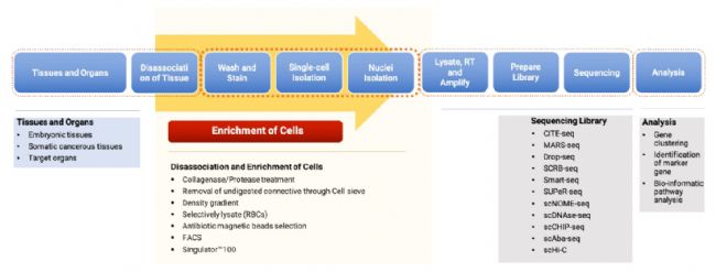 單細(xì)胞測(cè)序工作流程:1) 組織收集,2) 分離細(xì)胞制備,3) 測(cè)序文庫(kù)制備,4) 測(cè)序和 5) 分析。