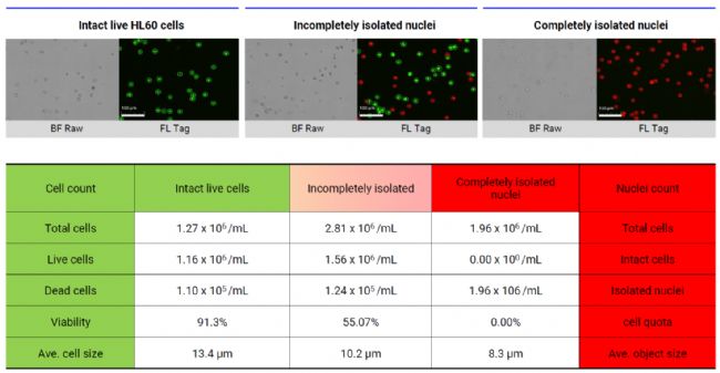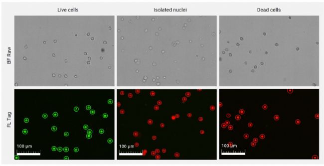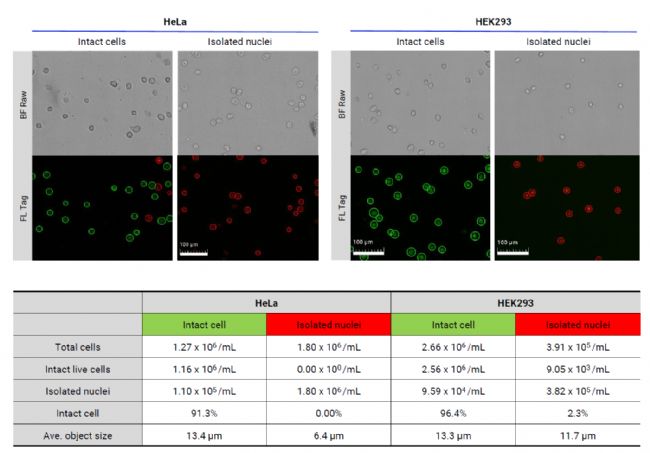 此外,LUNA-FX7的高分辨率明場(chǎng)圖像可用于目視驗(yàn)證分離核的質(zhì)量。例如,分離的細(xì)胞核可以很容易地與完整細(xì)胞區(qū)分開來(lái),因?yàn)榧?xì)胞核的邊界更薄,并且由于缺乏細(xì)胞膜而不明顯。