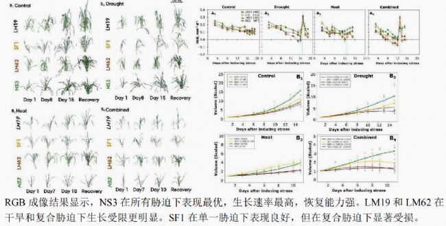 本研究中,根據(jù)熱敏感性篩選出四個(gè)基因型(熱敏感型:LM19、SF1;熱耐受型:LM62、NS3)。研究人員對(duì)分蘗期小麥植株實(shí)施四種脅迫處理:對(duì)照組、干旱脅迫、高溫脅迫及干旱與高溫聯(lián)合作用。干旱處理16天,高溫與復(fù)合脅迫均處理11天,之后3天恢復(fù)期。通過PlantScreen表型分析系統(tǒng)RGB,對(duì)植物在脅迫早期、晚期及恢復(fù)期的形態(tài)生理特征進(jìn)行了量化評(píng)估。