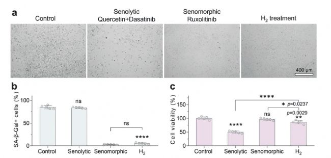 中國(guó)科學(xué)院深圳先進(jìn)技術(shù)研究院、上海交通大學(xué)的實(shí)驗(yàn)人員在上述文章中探究了局部釋放氫氣(H₂)能否重塑衰老微環(huán)境,從而改善老年動(dòng)物個(gè)體模型中受損骨骼的修復(fù)能力。在實(shí)驗(yàn)中,科研人員將AbMole的三款產(chǎn)品:Ruxolitinib(AbMole,M1787)、Quercetin(AbMole,M3902)和Dasatinib(AbMole,M1701)用于研究細(xì)胞的衰老變化[17]。